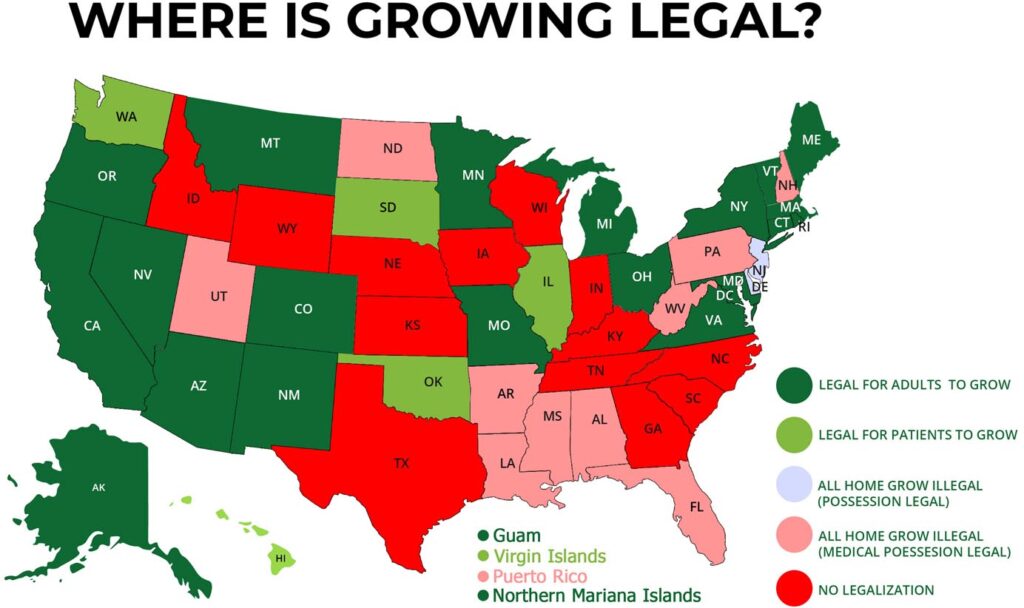 24 states, 3 territories, and the District of Columbia have legalized recreational cannabis, and most of them also permit personal cultivation.